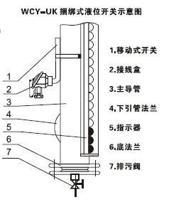 WCY-UK液位开关有二种形式。一种是固定式液位开关,根据用户不同要求(控制点高),产品出厂时已经固定。另一种是可移动式液位开关,这是为方便用户而生产的,该液位开关用户可自行调整,上下移动,到达所设定的控制点位置,所需控制点数量,在订货时注明。