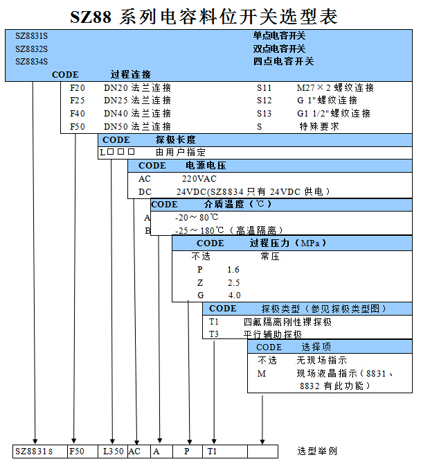 SZ88系列电容式物位开关物位测量产品,采用射频电容,将容器内的物位变化量转化成电容变化量,探极作为电容的一个极板,容器壁(或辅助探极)作为另一个极板,通过电子插件把电容量的变化转化成脉冲频率的变化,由微控制器来完成报警点的设定和报警动作的实现。它克服了以往传统测量方法(如充放电法等)报警精度低、调校步骤复杂给用户带来的不便,通过一只设定按键来确认报警点,并将此报警点长期存储。需改变报警点,需重新设定可。该物位开关适用于石油、化工、电力、冶金、机械、食品、制药、饲料等行业的液体、粉料及固体的料位测量与控制;并且产品有单点、双点、三点、四点可供选择。