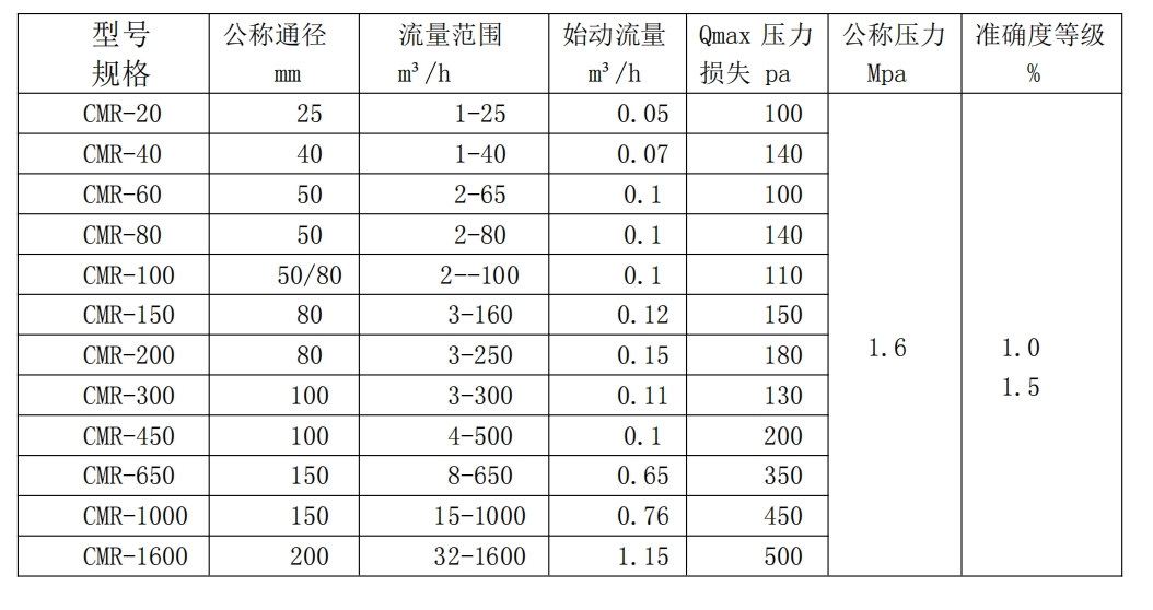 注:1.表中所列的流量范围为产品出厂检定时的流量范围(常温、常压下介质为空气,