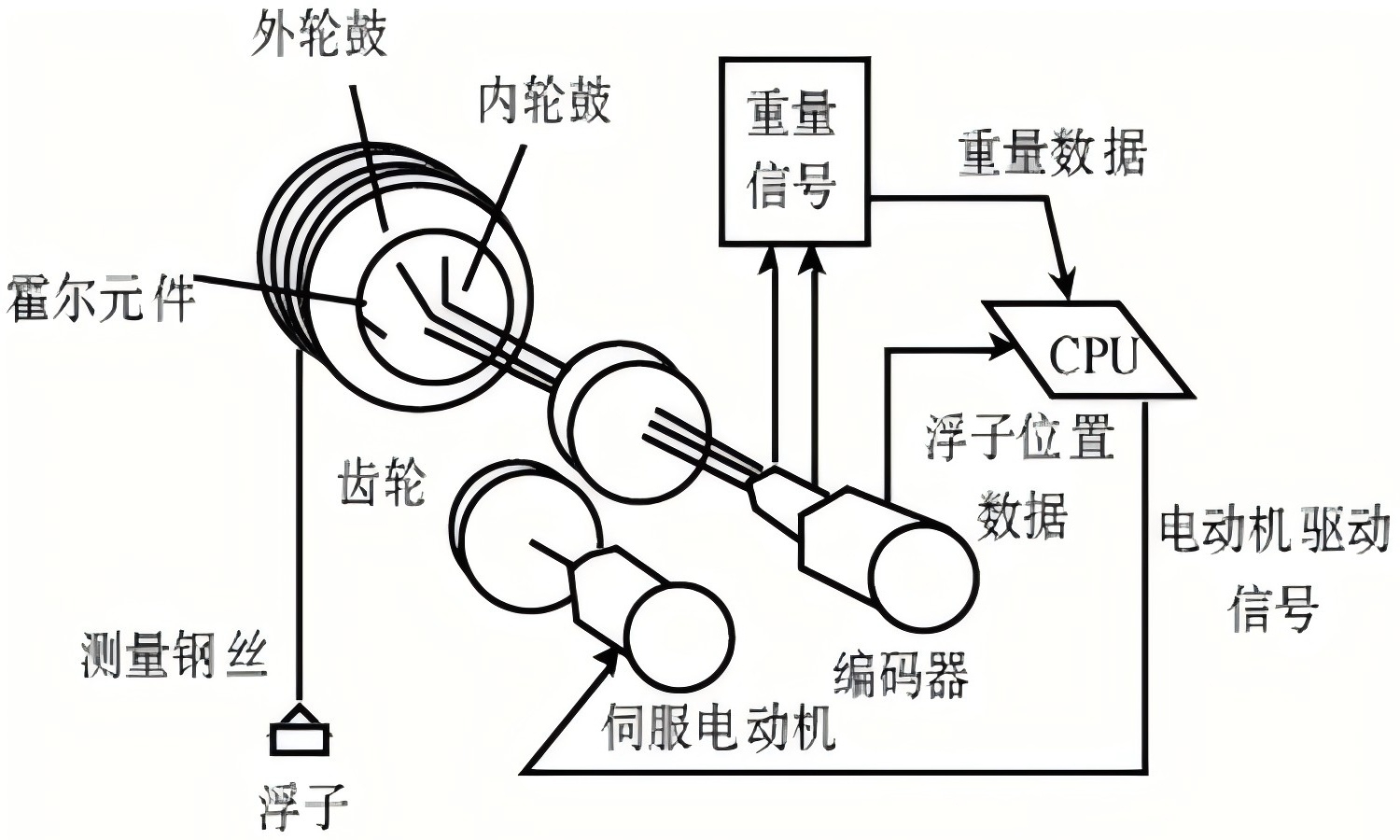 当液位计工作时,浮子作用于细钢丝上的重力在外轮鼓的磁铁上产生力矩,从而引起磁通量的变化。轮鼓组件间的磁通量变化导致内磁铁上的电磁传感器(霍尔元件)的输出电压信号发生变化。其电压值与储存于CPU中的参考电压相比较。当浮子的位置平衡时,其差值为零。当被测介质液位变化时,使得浮子浮力发生改变。其结果是磁耦力矩被改变,使得带有温度补偿的霍尔元件的输出电压发生变化。该电压值与CPU中的参考电压的差值驱动伺服电动机转动,调整浮子上下移动重新达到平衡点。整个系统构成了一个闭环反馈回路(如图1所示),其精确度可达正负0.7mm,而且,其自身带有的挂料补偿功能,能够补偿由于钢丝或浮子上附着被测介质导致的钢丝张力的改变。